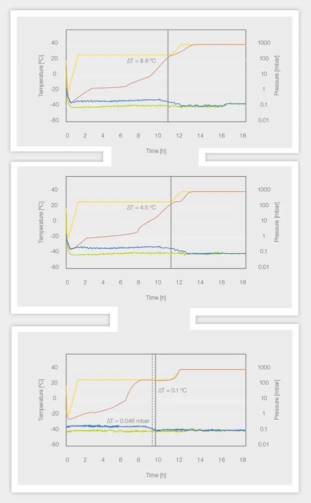 上圖所示為壓差為 0.05 mbar 的結(jié)果,中間圖為 0.03 mbar,底圖為 0.025 mbar 作為終點(diǎn)標(biāo)準(zhǔn)。在達(dá)到終點(diǎn)標(biāo)準(zhǔn)之前,壓差至少保持 60 分鐘。隔板溫度用黃線表示,樣品溫度用紅線表示,干燥箱壓力用綠線表示,皮拉尼壓力計(jì)在初級干燥(白色陰影)和二級干燥(灰色陰影)上用藍(lán)線表示。同時(shí)顯示達(dá)到壓力(黑線)和溫度終點(diǎn)標(biāo)準(zhǔn)(黑色虛線)的時(shí)間,以及該點(diǎn)相應(yīng)的溫度和壓力差。
