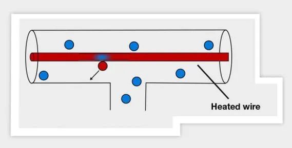 該技術(shù)使用兩種不同的壓力計(jì),一個(gè)皮拉尼傳感器和一個(gè)電容壓力計(jì)。皮拉尼傳感器的工作原理是氣體的熱導(dǎo)率隨壓力變化。壓力計(jì)用一根細(xì)導(dǎo)線懸掛在氣體中,用電流加熱來測量壓力。在高壓下,由于周圍氣體分子與金屬絲的高碰撞率,金屬絲將熱能損失給氣體。這一原理如下圖所示。