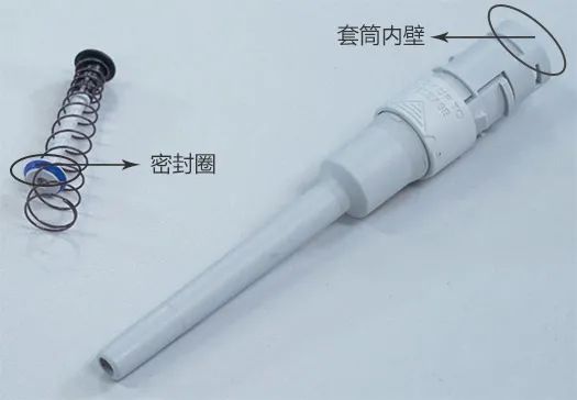 內部清潔主要是針對套筒;如果活塞、彈簧等也有污漬,也需要清潔。使用肥皂液、洗潔精或 60 % 異丙醇清潔, 并用雙蒸水淋洗干凈,晾干后再組裝;